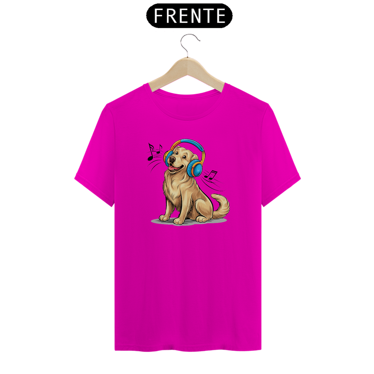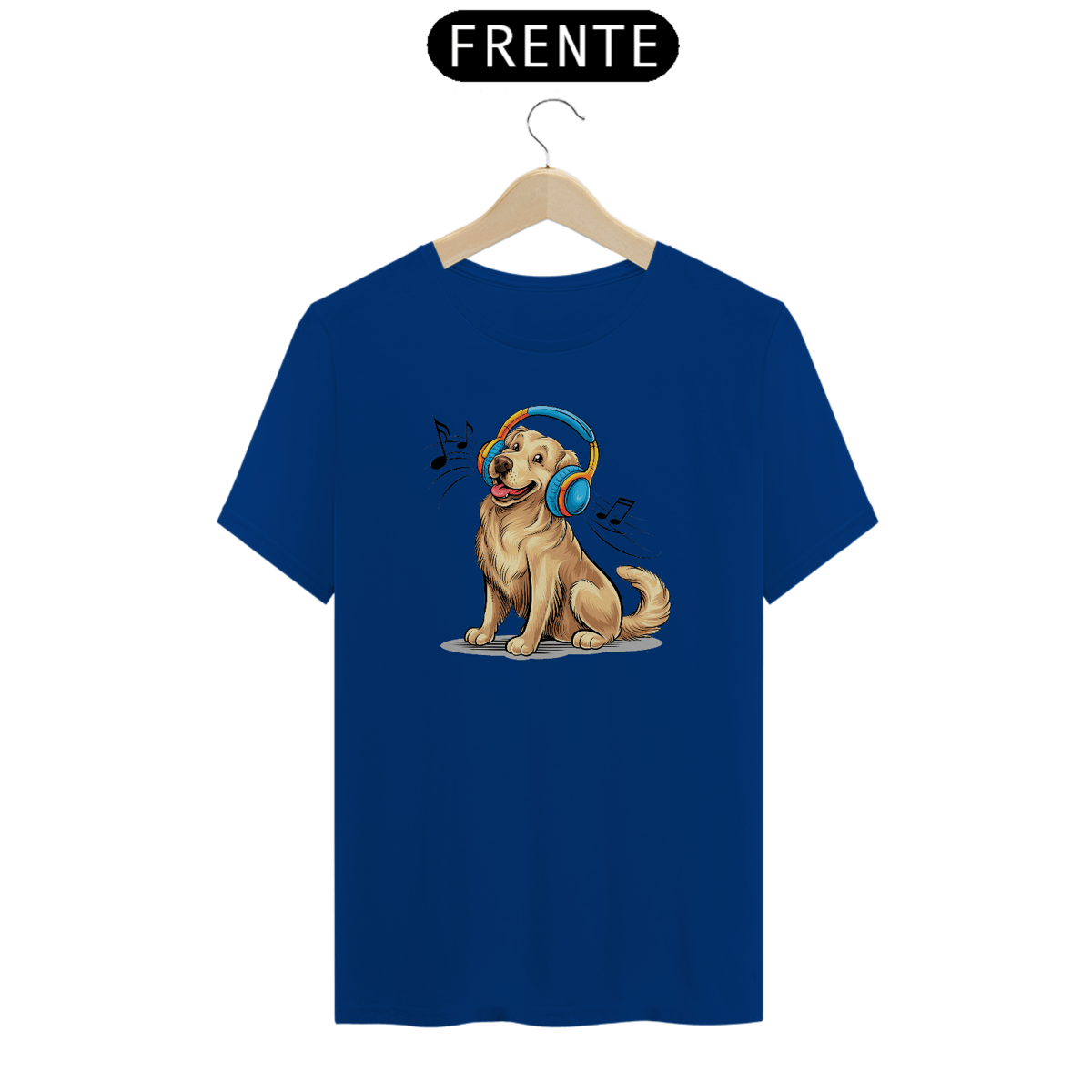 Uma estampa da marca Camaleon,  deliciosa e vibrante de um alegre Shih  com fones de ouvido grandes e coloridos. O cão,  curtindo uma música animada com  fones de ouvido  azuis brilhantes.