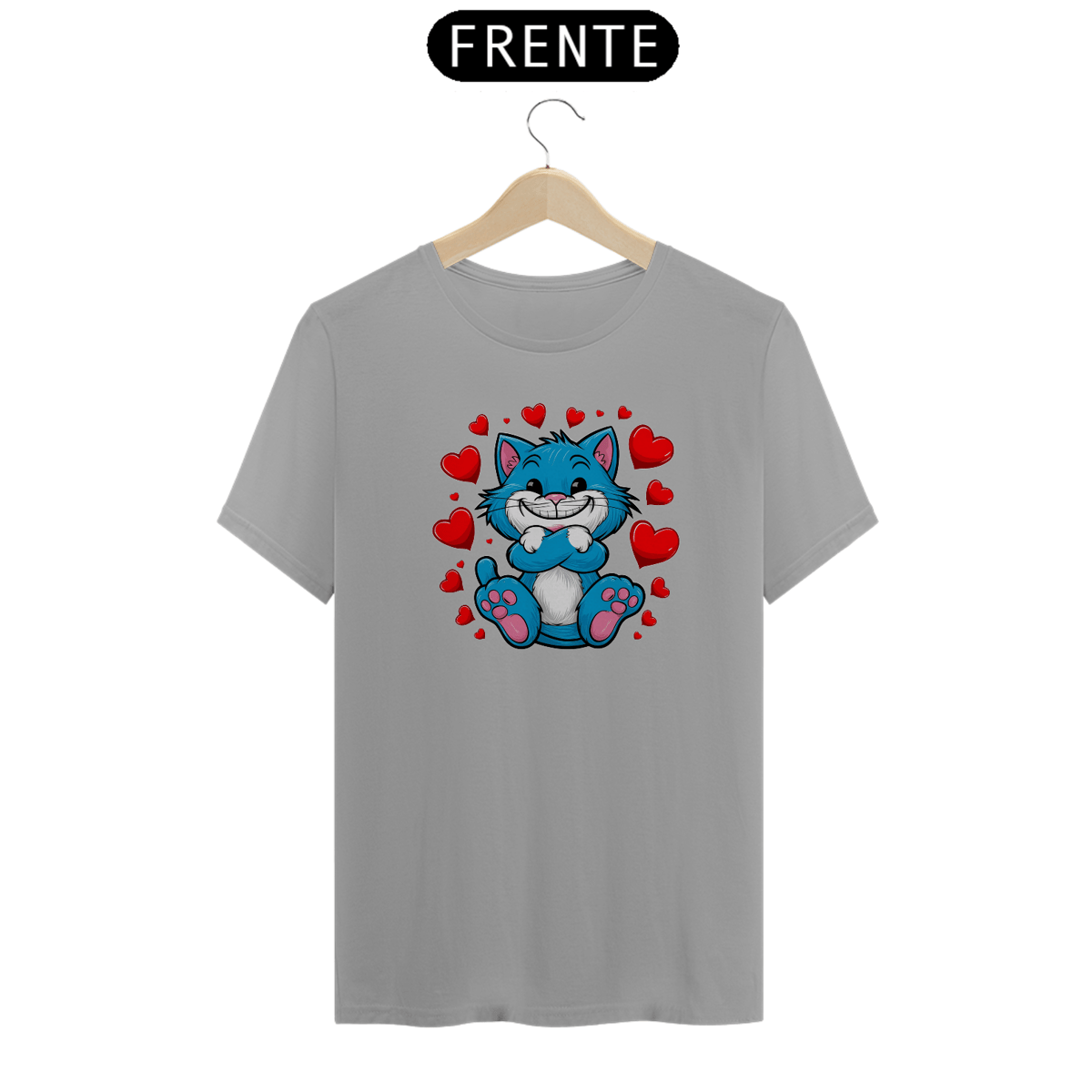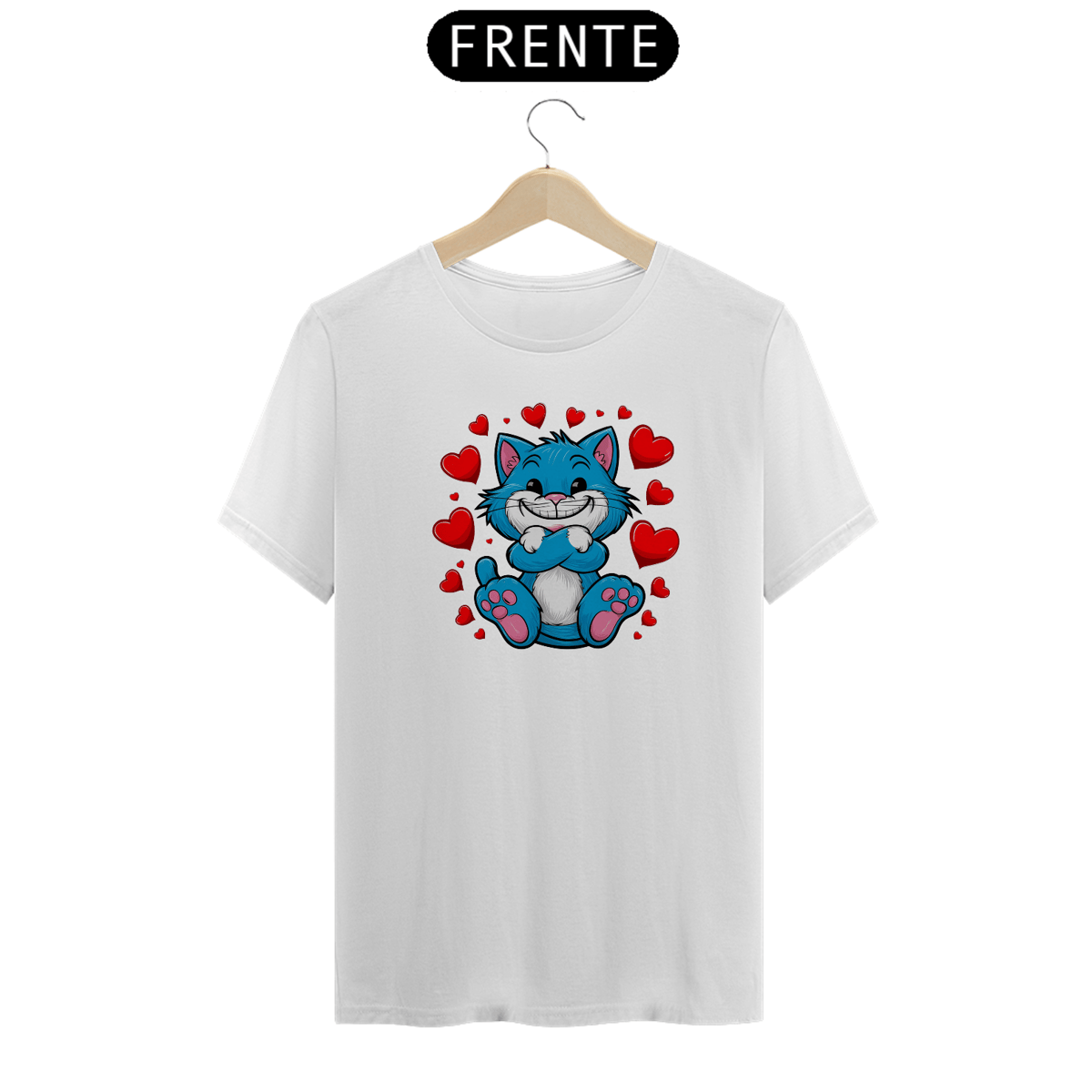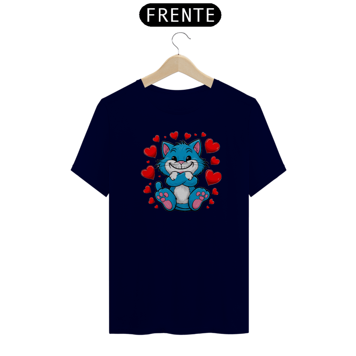 Uma estampa de um gato adorável e brincalhão, com pelo azul brilhante e um sorriso contagiante. Suas patas estão cruzadas, exalando uma aura de fofura. Ao redor do gato há corações vermelhos que flutuam, aumentando a atmosfera encantadora. Desenhado em um estilo simples e infantil com bordas arredondadas e cores vibrantes, o gato de desenho animado é colocado contra um fundo branco imaculado. A imagem geral exala felicidade e calor.