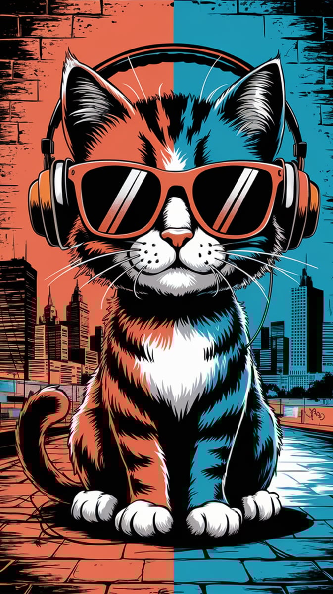 Estampa de arte pop de rua de um gato com óculos escuros e fones de ouvido. O gato está sentado em uma parede de tijolos.