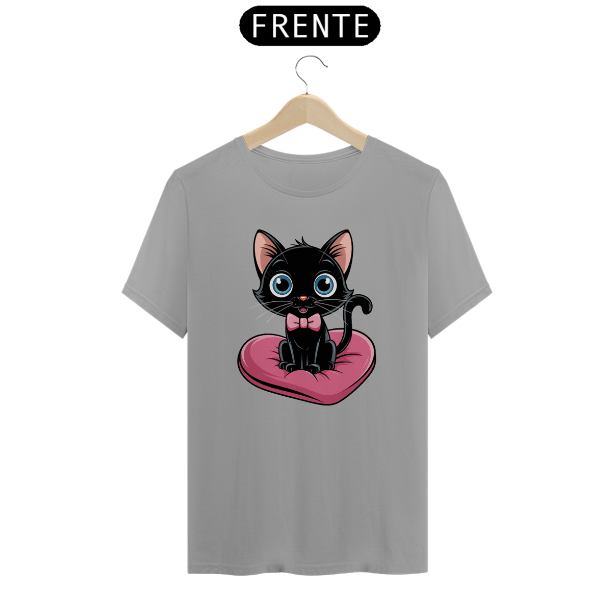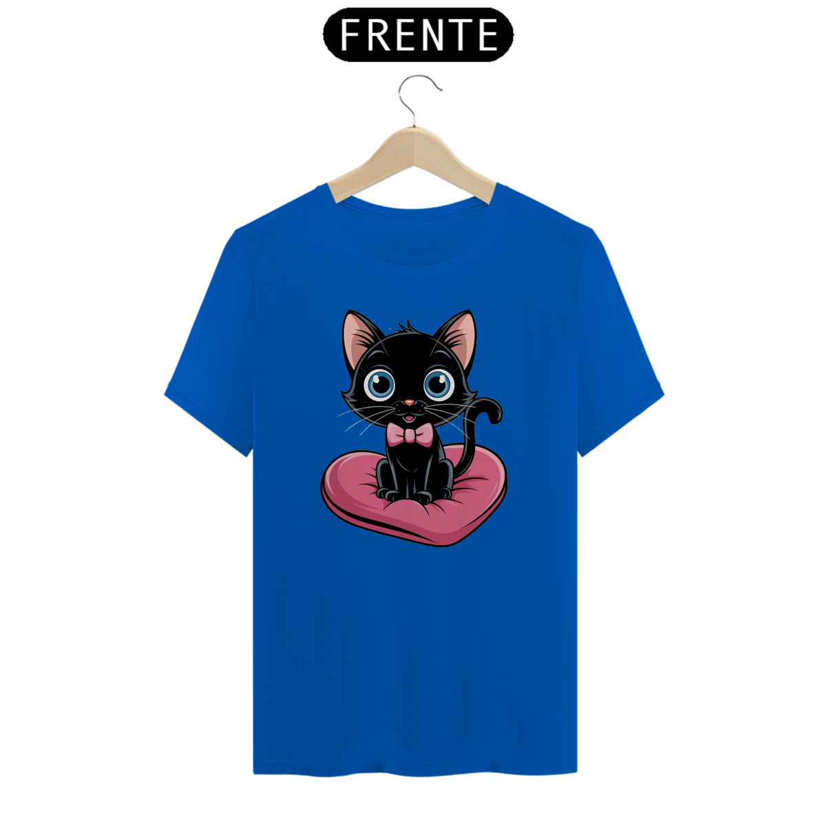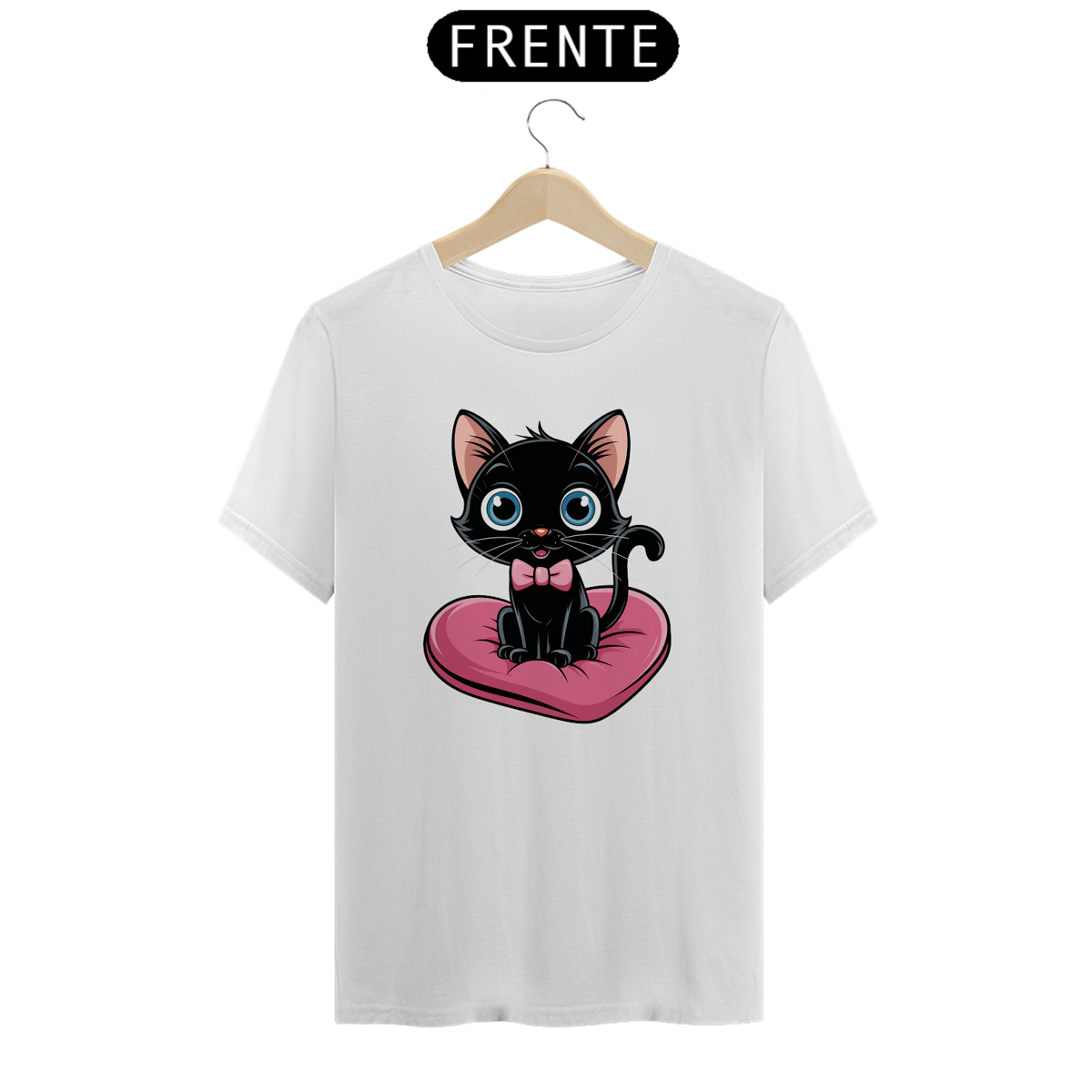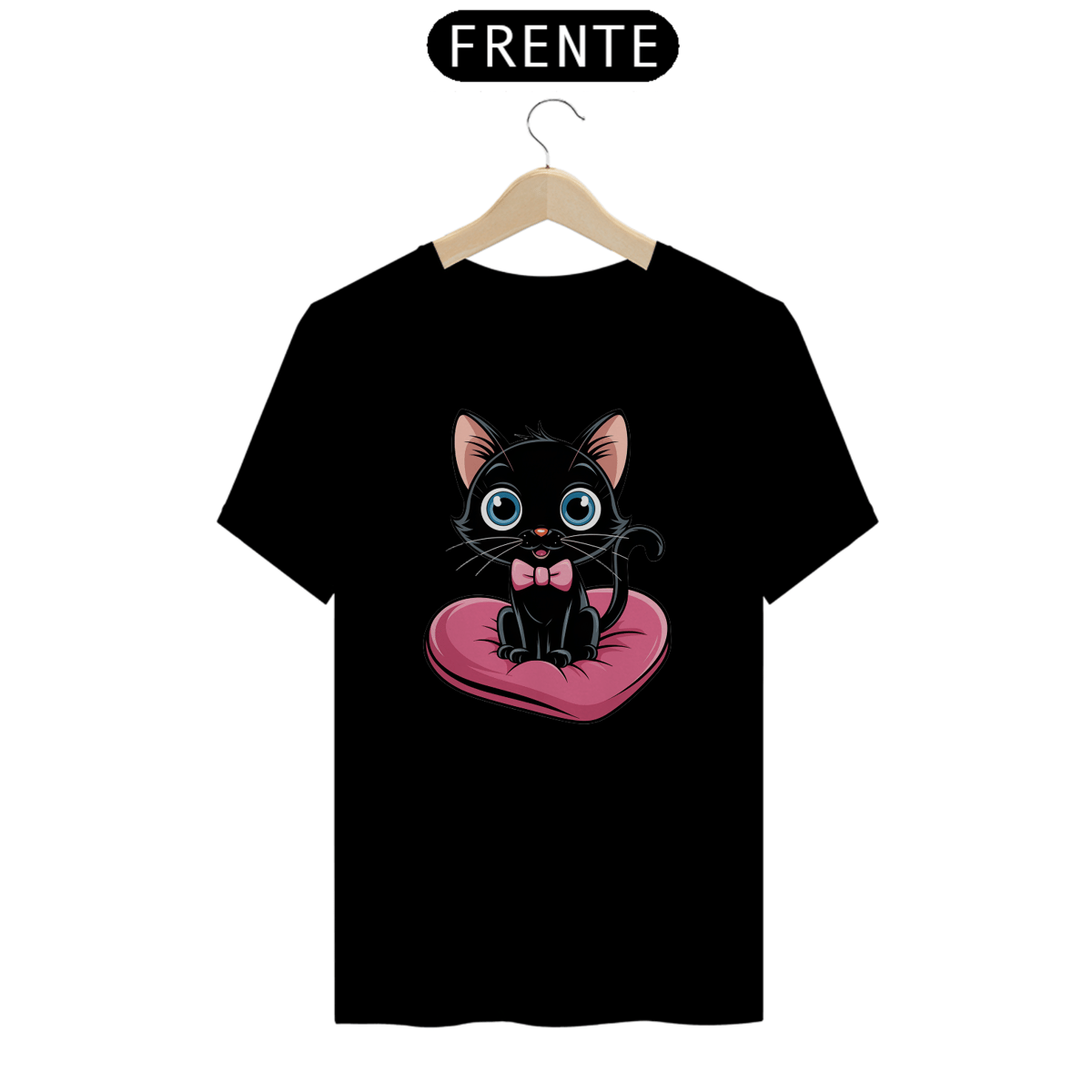 Um plano médio estilo desenho animado de um gato preto fofo com olhos azuis brilhantes. O gato está sentado em uma almofada rosa em forma de coração. O gato está usando uma gravata borboleta rosa.