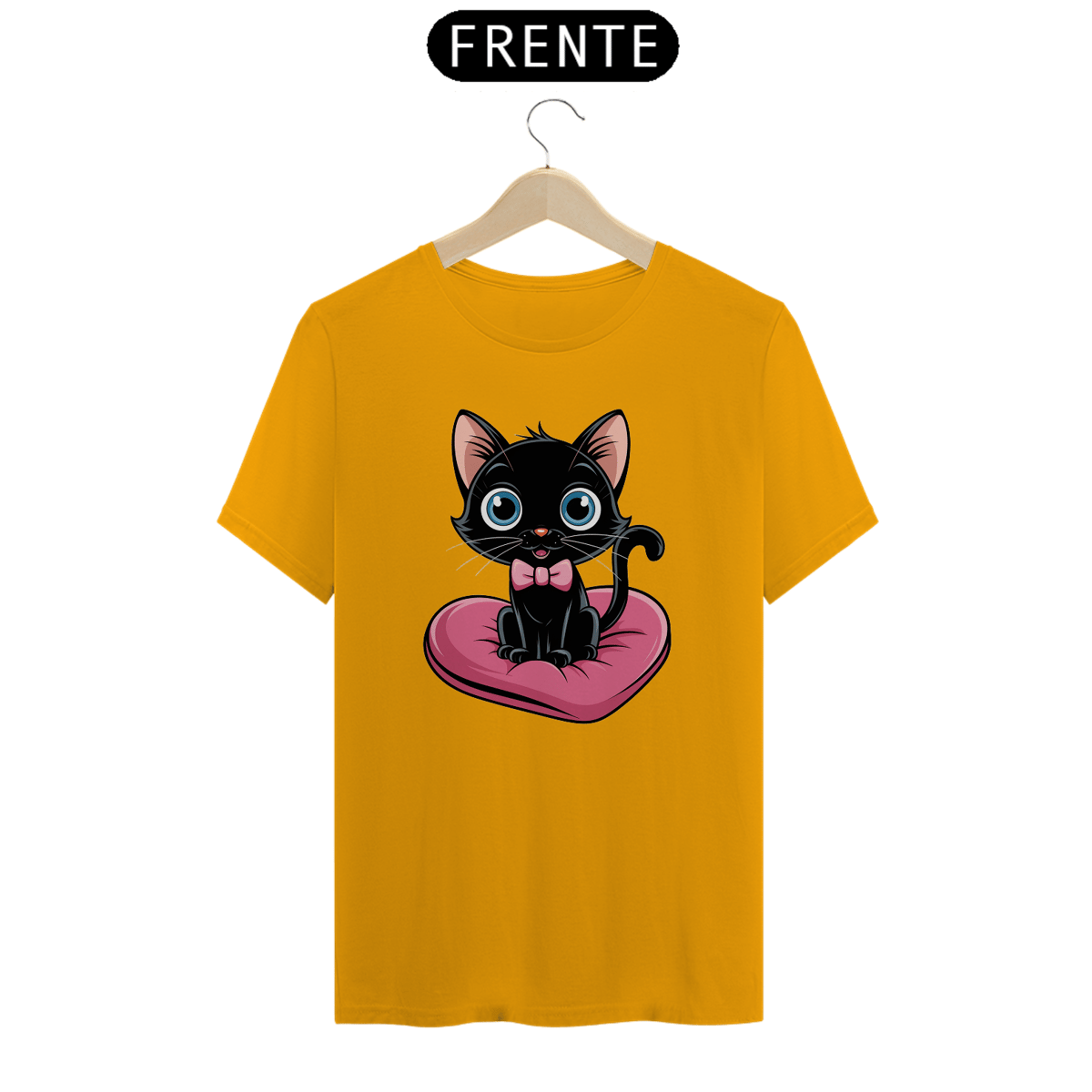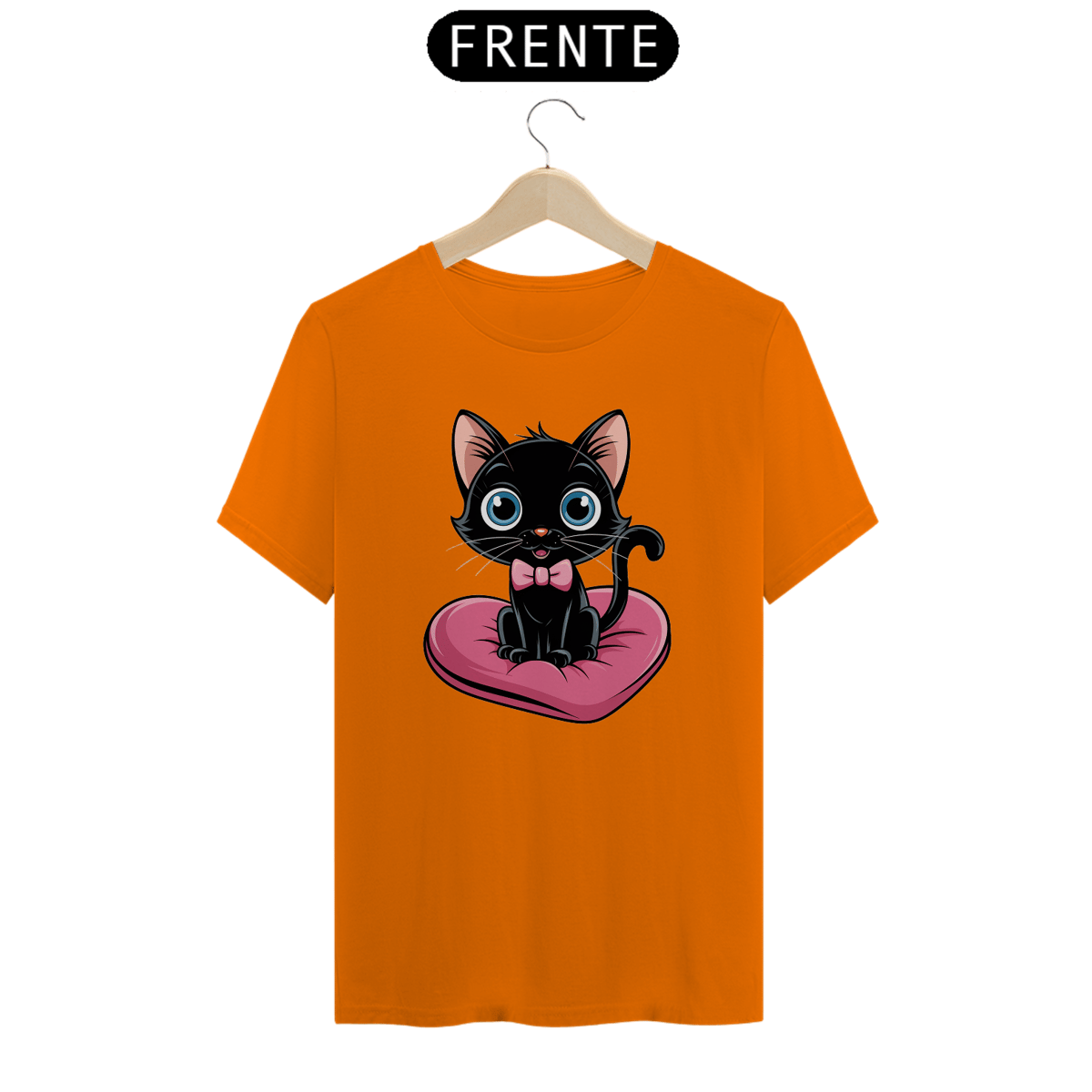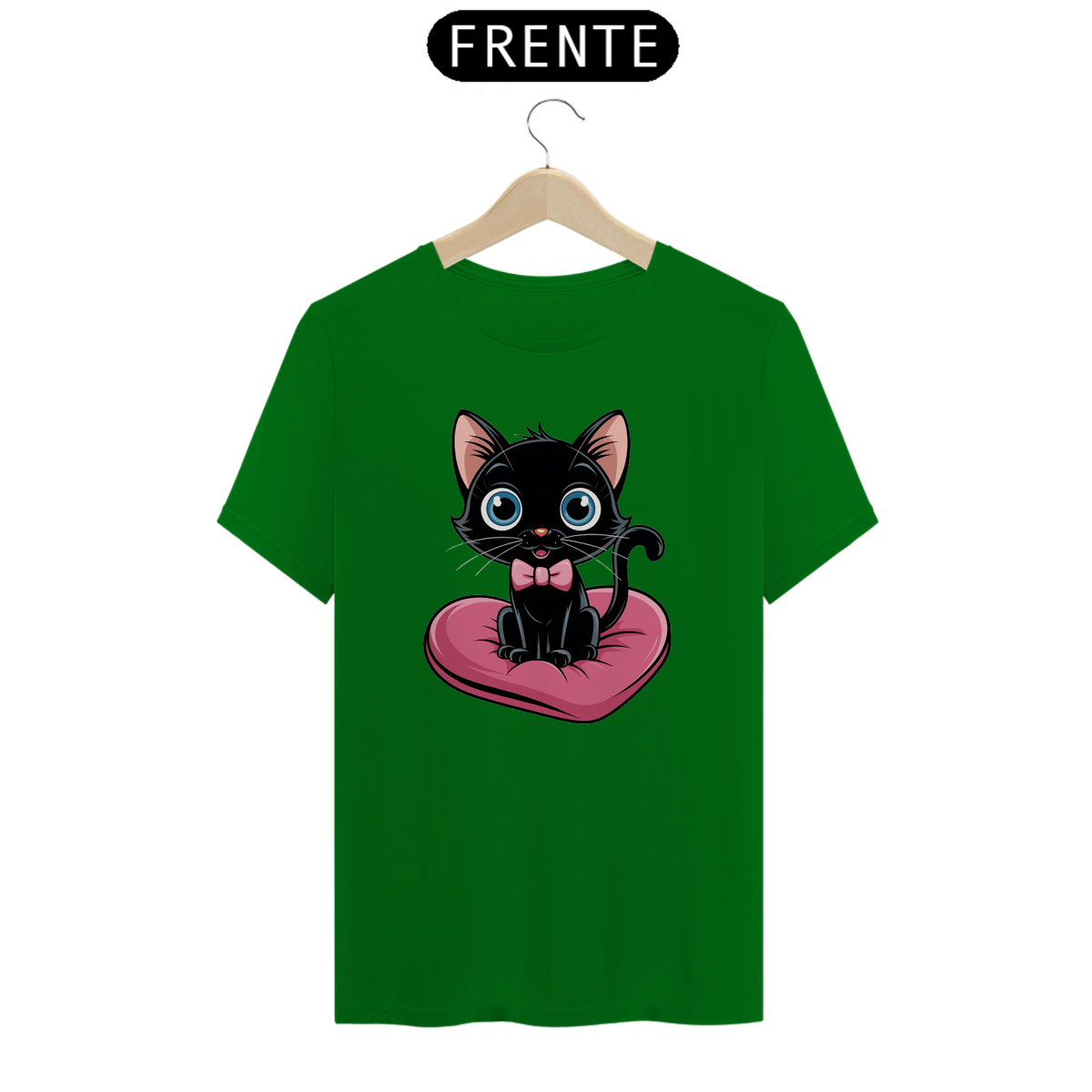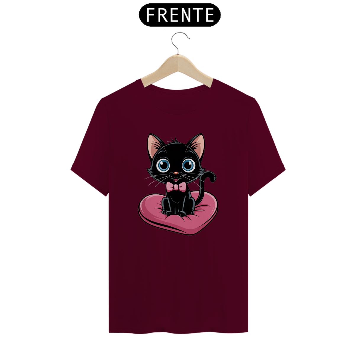 Um plano médio estilo desenho animado de um gato preto fofo com olhos azuis brilhantes. O gato está sentado em uma almofada rosa em forma de coração. O gato está usando uma gravata borboleta rosa.