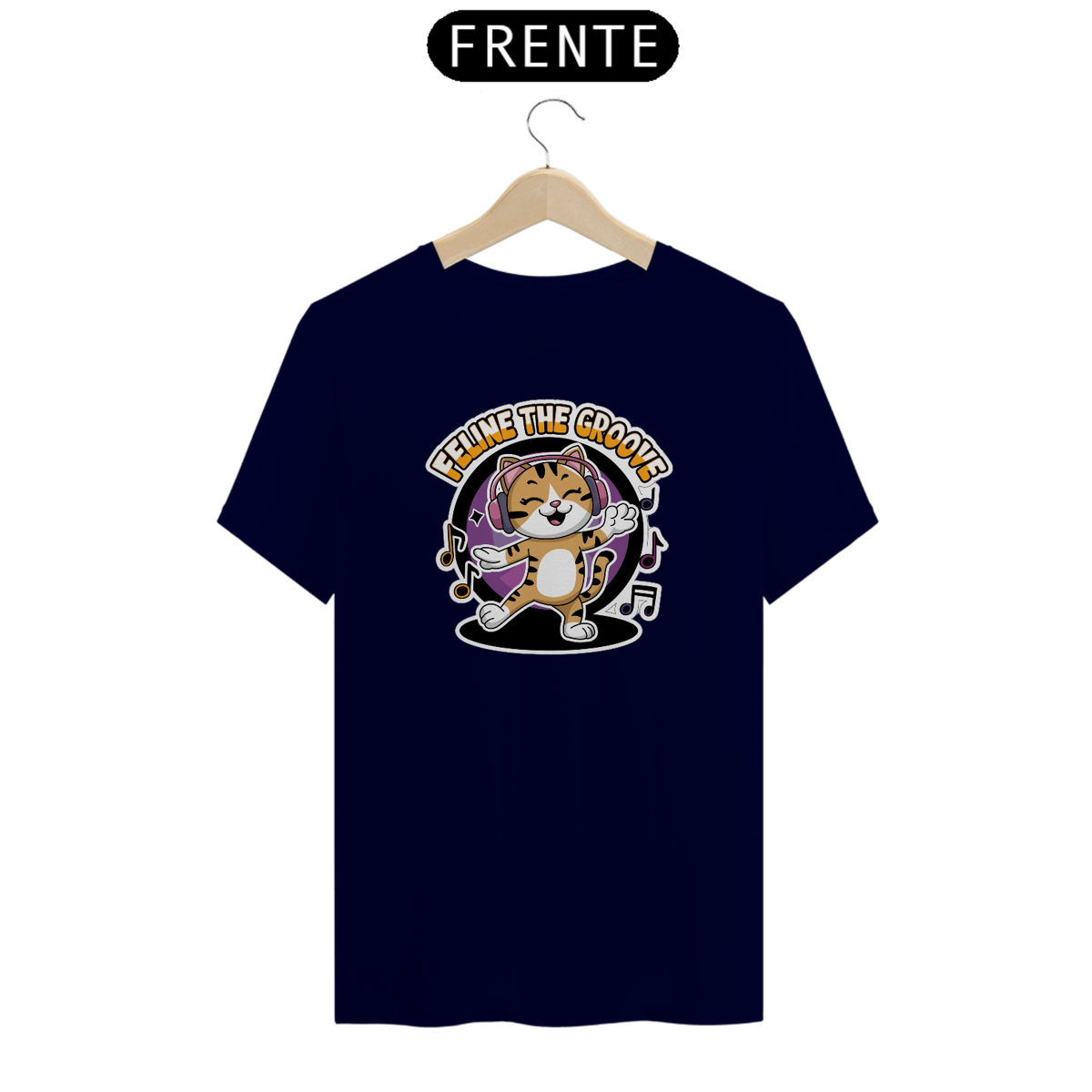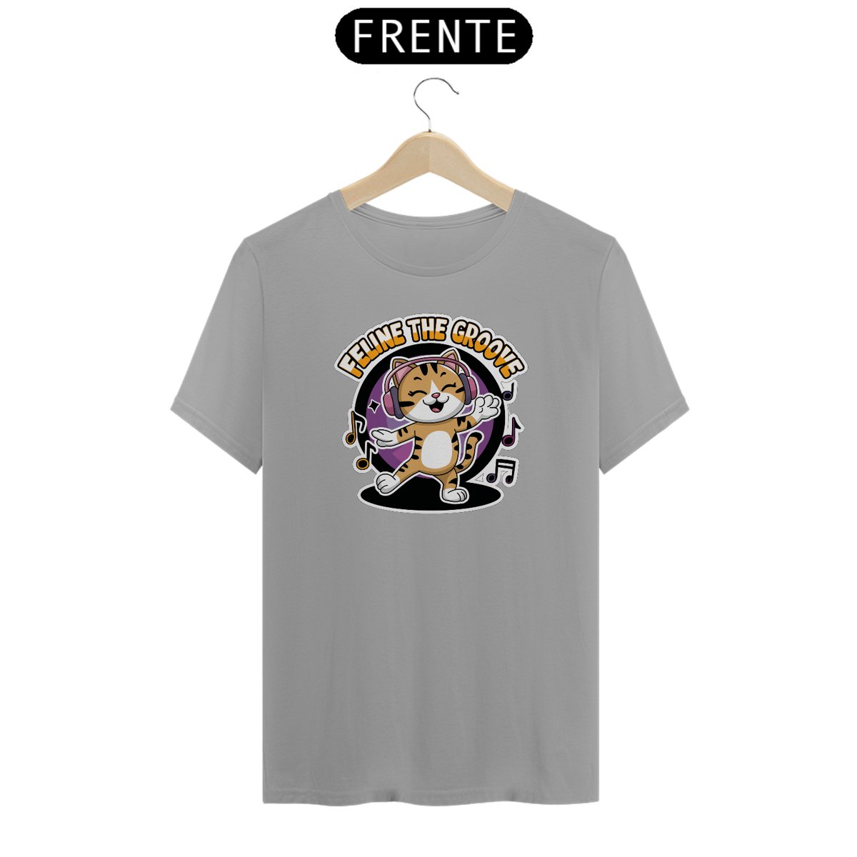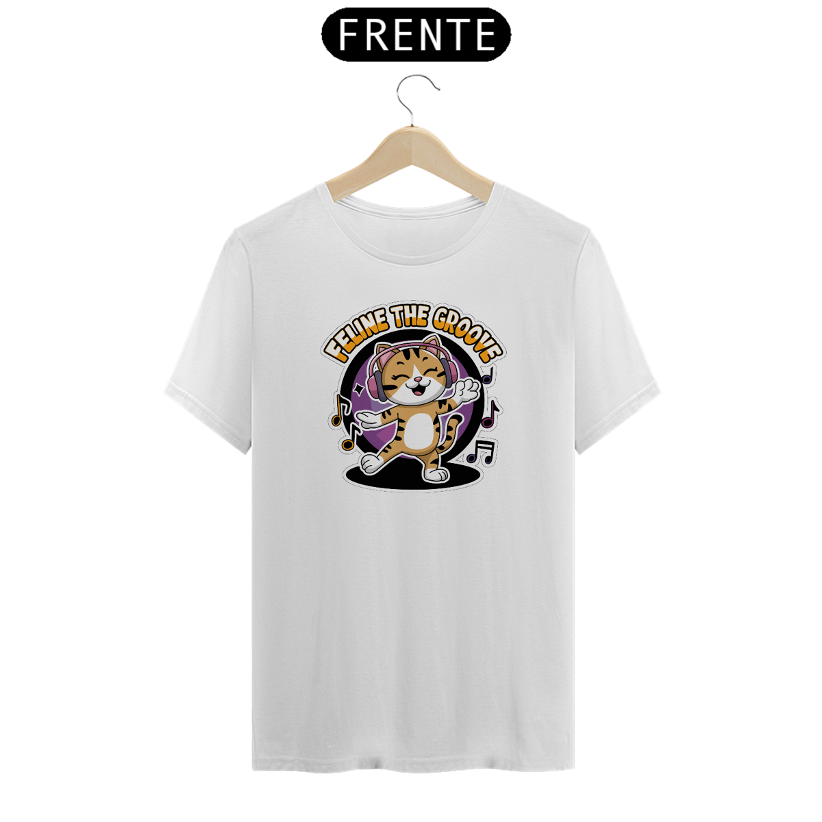 Uma estampa de desenho animado de um gato com fones de ouvido dançando. O gato está usando um par de fones de ouvido e está dançando com os olhos fechados. O fundo é uma nota musical. O texto acima do gato diz "Feline the Groove". O estilo é uma ilustração de desenho animado.