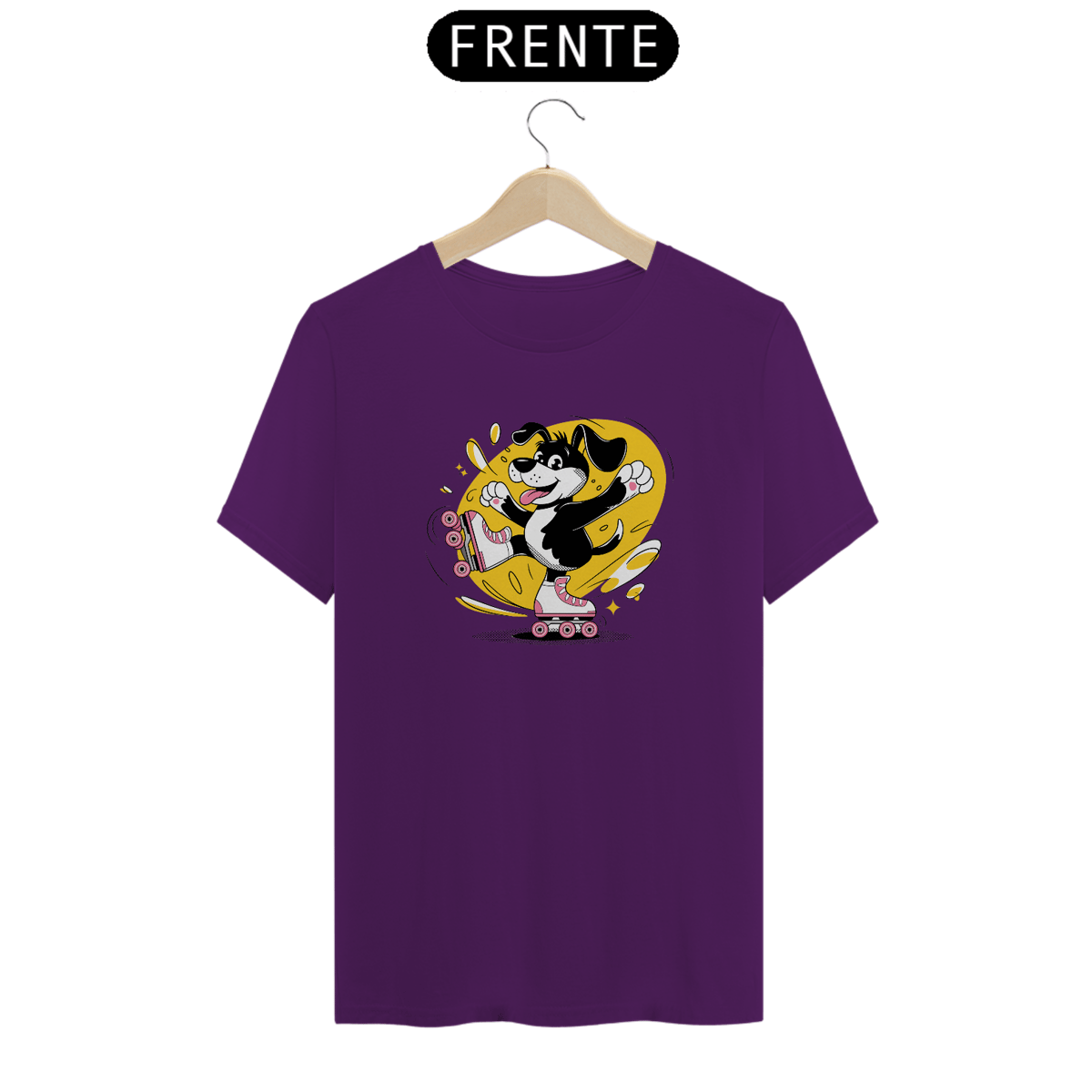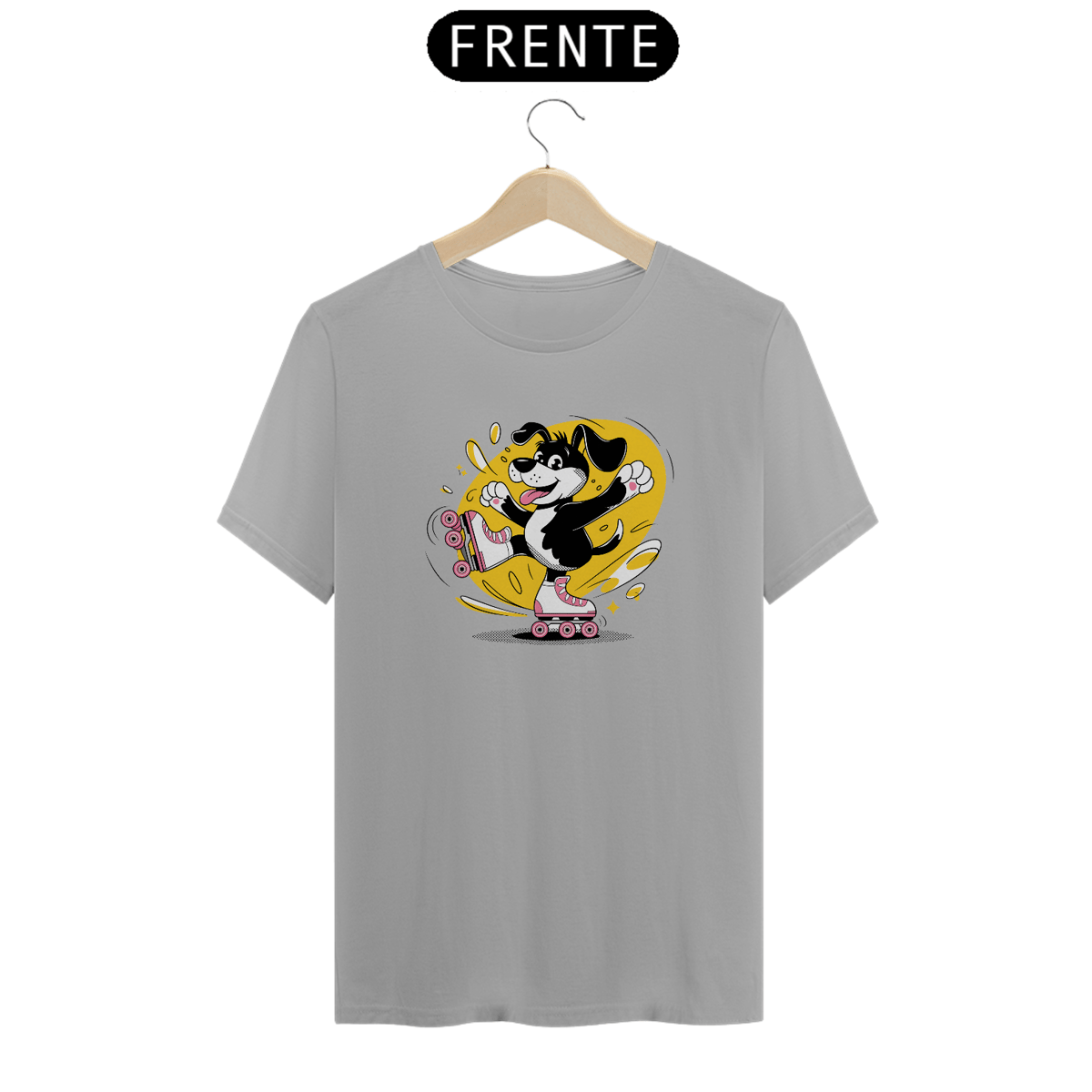 movimento, levantando uma perna enquanto usa patins inline rosa e branco com quatro rodas visíveis alinhadas em uma única fileira em cada pé. O cão está sorrindo com a língua para fora, se divertindo e despreocupado. Atrás do cão, redemoinhos amarelos e rabiscos lúdicos enfatizam o movimento energético. O cão preto, destacado com sombreamento de meio-tom, contrasta lindamente com o fundo amarelo brilhante, criando uma atmosfera animada e alegre.