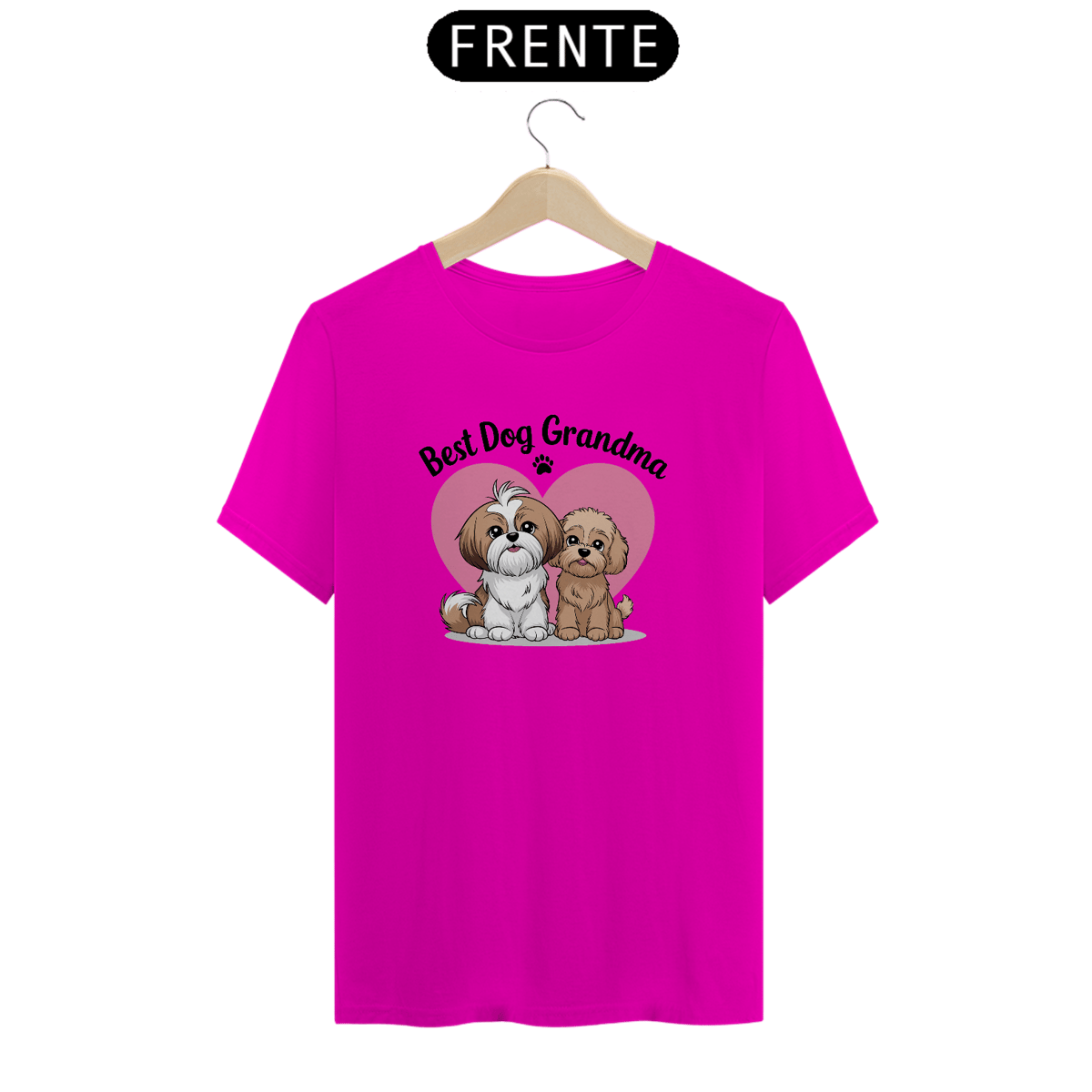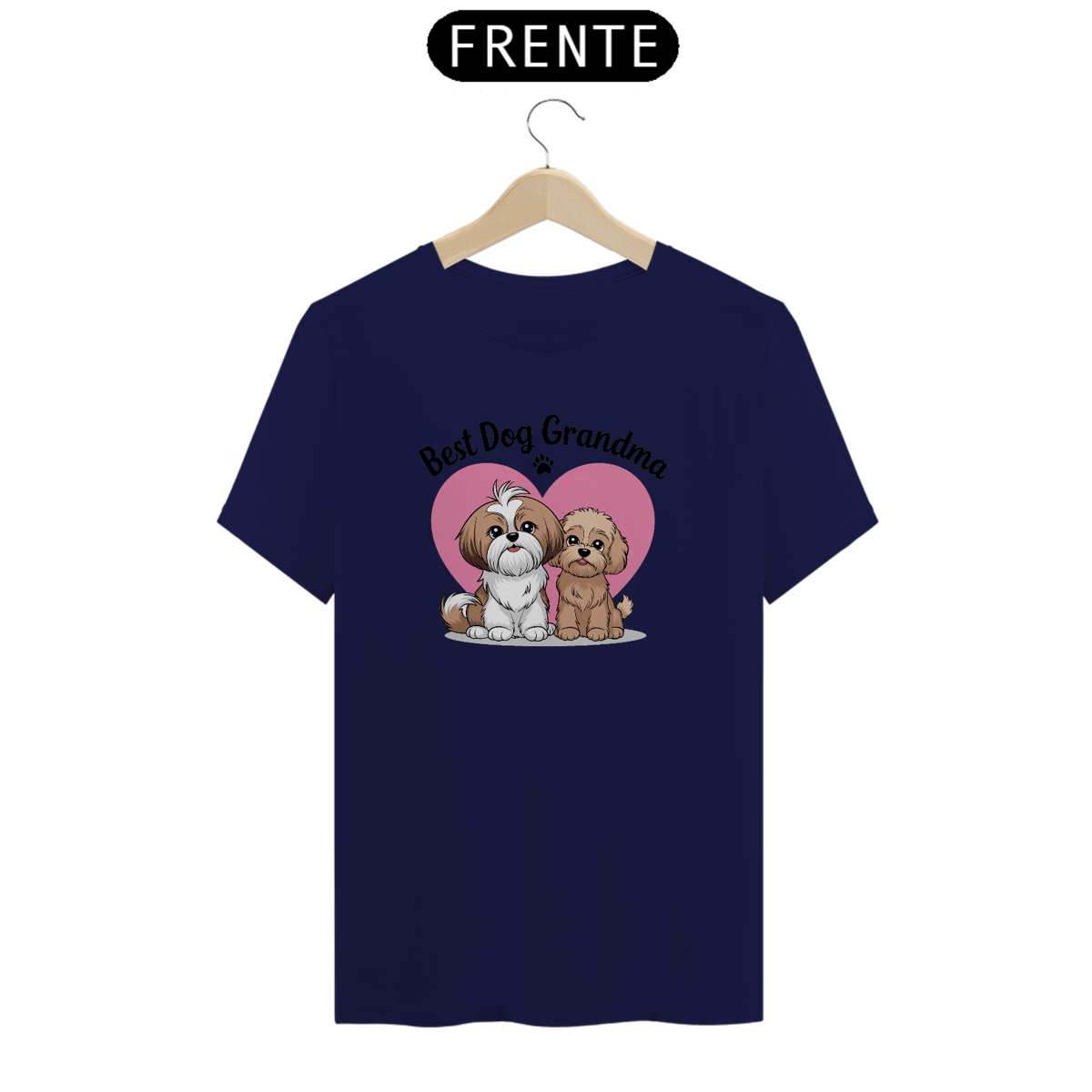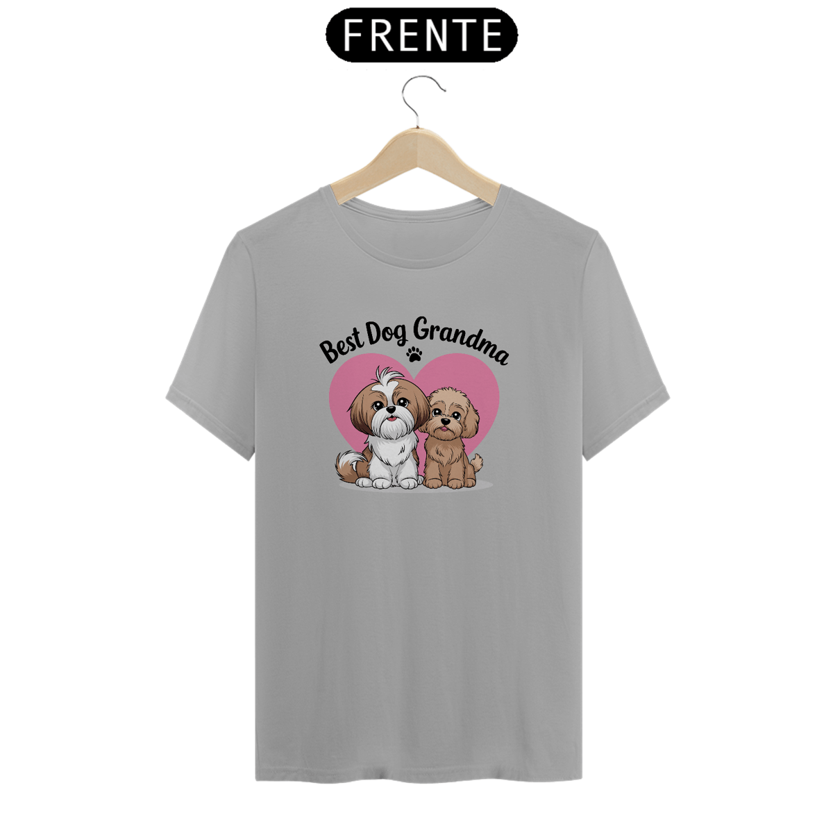 Uma estampa em estilo cartoon de um Shih Tzu e um Maltipoo. O Shih Tzu é mais velho e tem pelo branco e marrom, enquanto o Maltipoo é mais novo e tem pelo marrom. Eles estão sentados,há um coração rosa entre os cães. Acima dos cães, está escrito "melhor avó canina" com uma pata no lugar da letra "o".