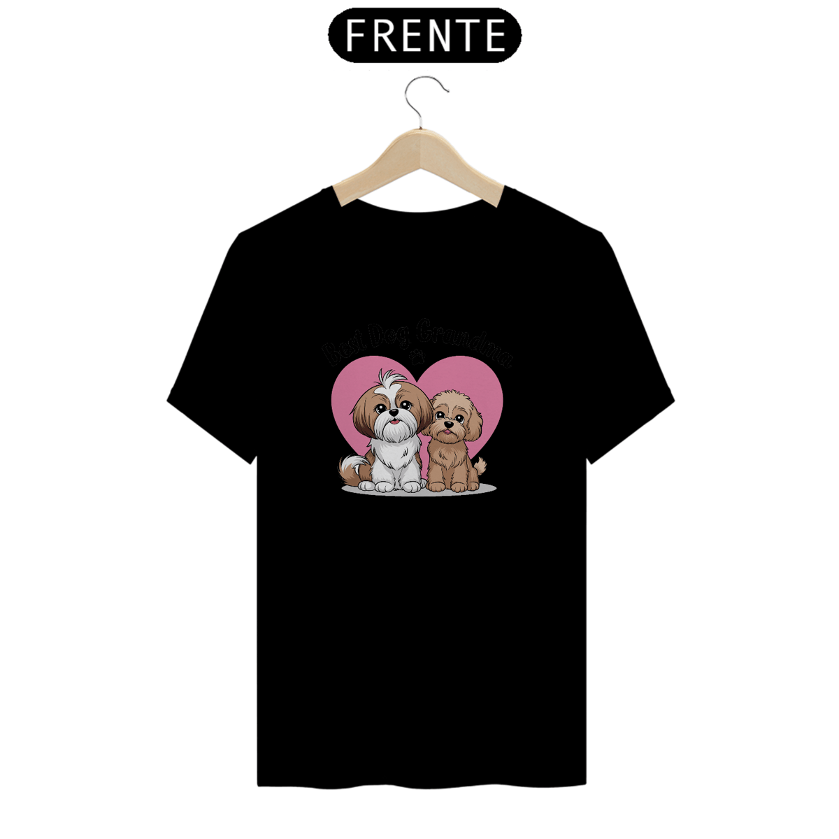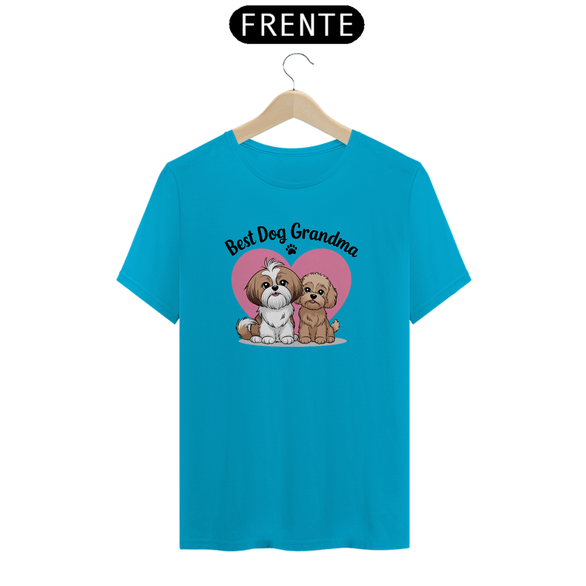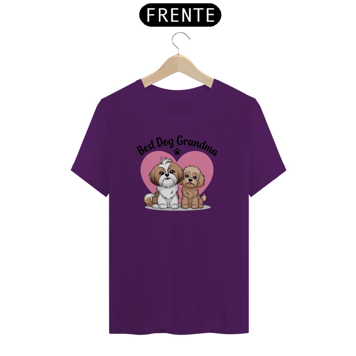 Uma estampa em estilo cartoon de um Shih Tzu e um Maltipoo. O Shih Tzu é mais velho e tem pelo branco e marrom, enquanto o Maltipoo é mais novo e tem pelo marrom. Eles estão sentados,há um coração rosa entre os cães. Acima dos cães, está escrito "melhor avó canina" com uma pata no lugar da letra "o".