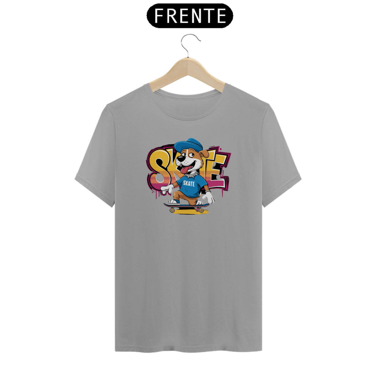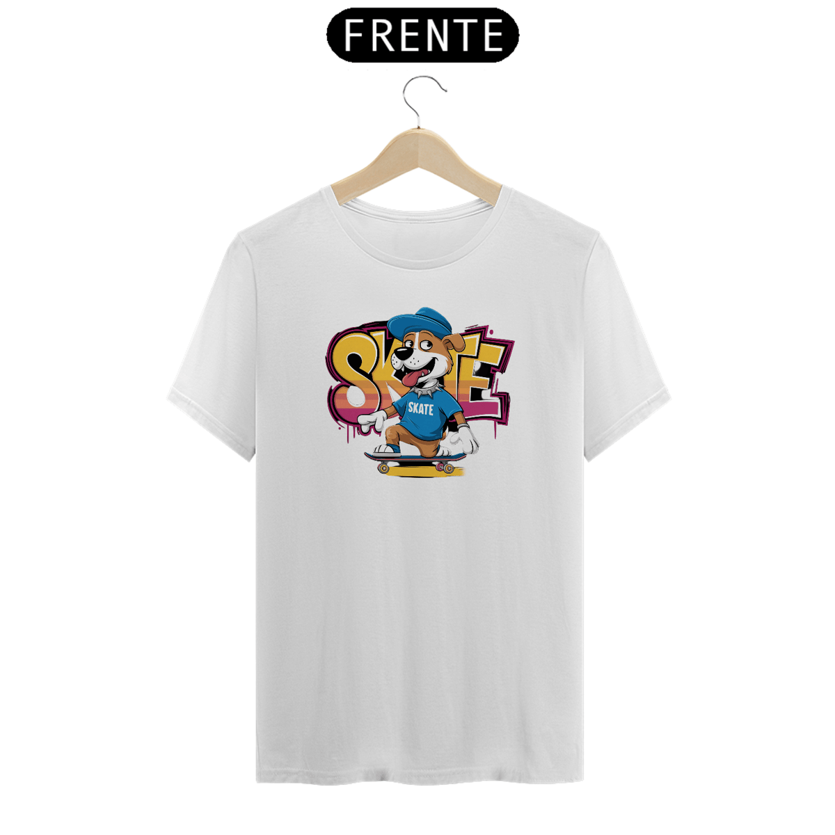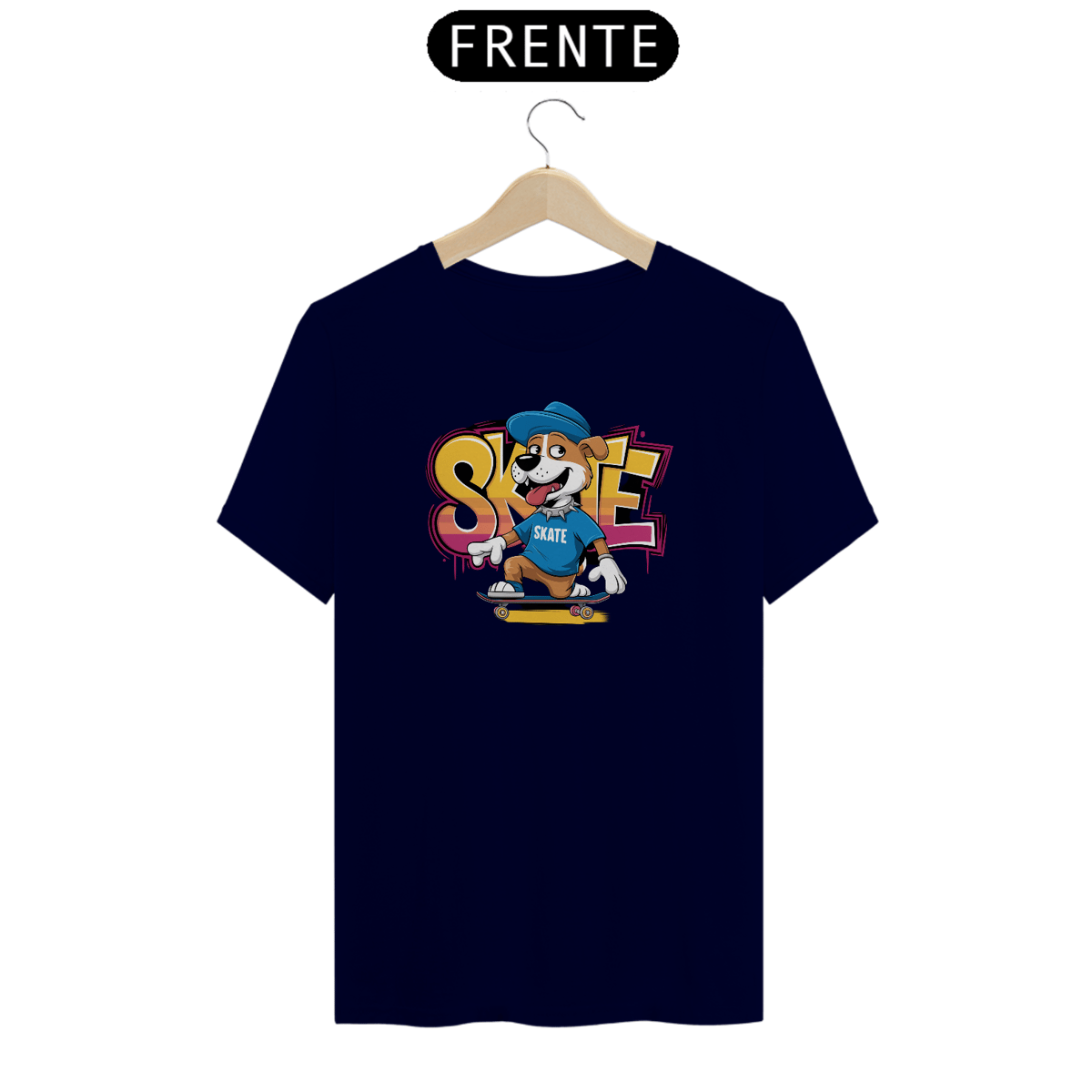 Uma estampa de um cachorro usando um chapéu azul, uma camiseta azul que diz "Skate" e uma coleira com pontas. O cachorro está com a boca aberta e a língua para fora. Ele está em pé em um skate e tem os braços estendidos na frente dele. Há um grafite vibrante no fundo que diz "Skate".
