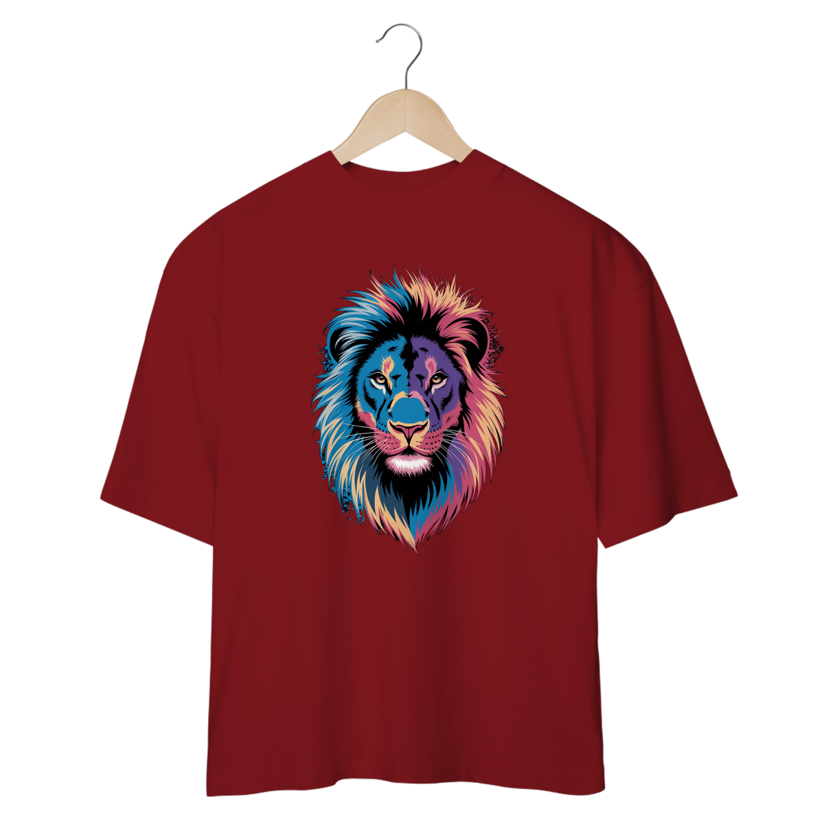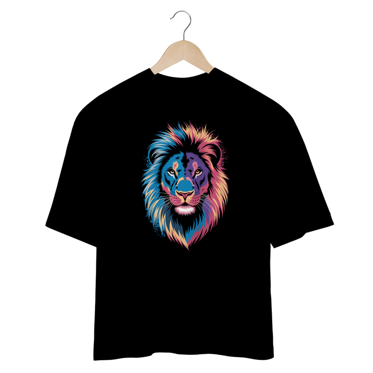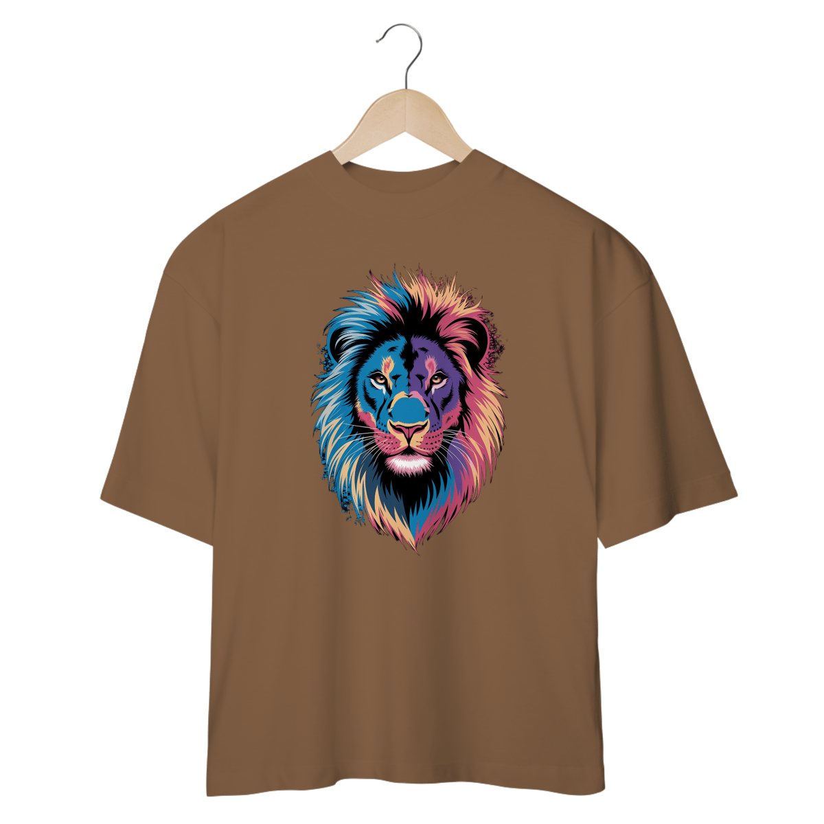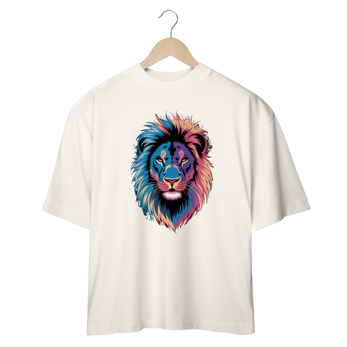 Uma estampa altamente detalhada e vívida de um gráfico leão com um fundo multicolorido. A estampa tem estética synthwave.